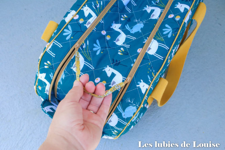 Une autre particularité importante de ce sac est son ouverture à double glissière. Je tenais vraiment à ce détail pratique pour pouvoir y glisser mon coussin de yoga très facilement. Je ne vous cache pas que ce fut le point technique le plus compliqué à élaborer.